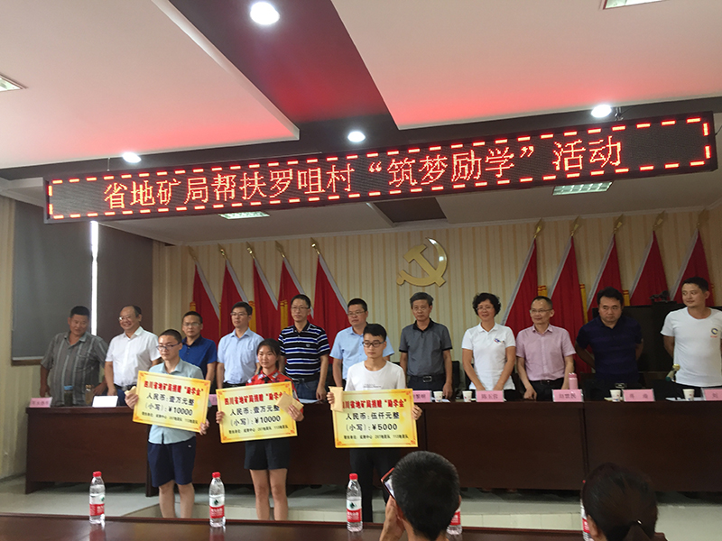 在2019年的高考中,甘洛县罗咀村的高考学子取得了良好成绩,三人收到一本录取通知书,其中的两人还分别取得了甘洛县文理科第一的好成绩。8月21日,中心与207地质队、113地质队三家单位共同前往甘洛县田坝镇,举办罗咀村“筑梦励学”活动,为罗咀村的三名准大学生送上了励学金,并向该村的青少年学生送上了纪念品。
