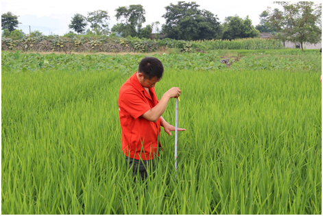 中心研究人员认真监测了试验田水稻生长情况,对试验田中水稻生长的阶段、过程进行观测,测定记录了分蘖期水稻株高、分蘖株数,并对试验田土壤进行了现场取样。