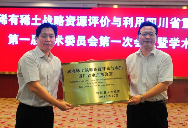 揭牌仪式由四川省地矿局党委副书记尹江川主持。四川省地矿局党委书记、局长王建明致欢迎辞,四川省科技厅基础处张雄处长代表四川省科技厅宣读了四川省科技厅关于同意建立“稀有稀土战略资源评价与利用四川省重点实验室”的批文。四川省科技厅副厅长景世刚为“稀有稀土战略资源评价与利用四川省重点实验室”授牌并代表学校为学术委员会主任、实验室主任以及学术委员会委员颁发了聘书。