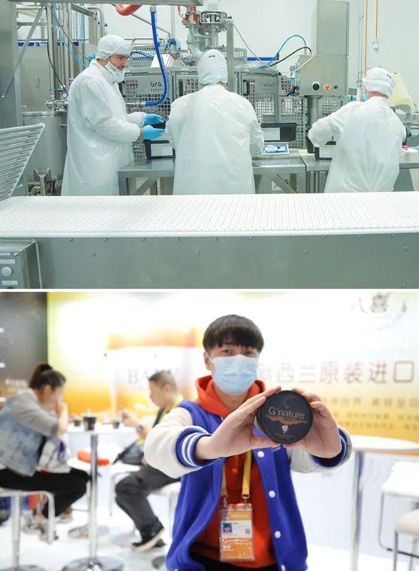 这是一张拼版照片,上图为艾莱发喜新西兰公司员工在冰激凌生产线上工作(资料照片,新华社发);下图为11月7日,工作人员在第三届进博会展台展示从新西兰进口的冰激凌(新华社记者 张玉薇 摄)。新华社发