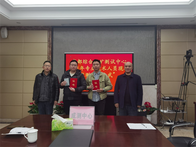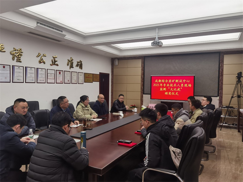 1月11日,成都综合岩矿测试中心2021年专业技术人员现场监测“大比武”颁奖仪式在中心大会议室举行。中心主任胡斯宪、党委书记吴天学、副主任杨晓军出席了颁奖仪式并为获奖选手颁奖。