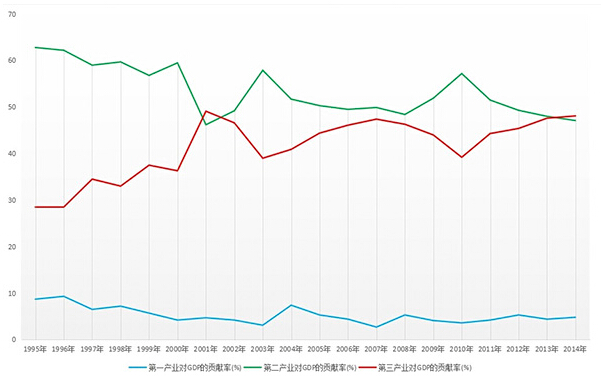 笔者认为:一方面,到2008年时,我国基础设施处于超前建设,已经基本满足当前需求,也不需要再进行如此大规模的建设。一方面,这种依靠粗放式、依靠投资的工业增长模式带来的社会、生态、经济代价太大,难以持续。另一方,我国当时正处于工业经济和服务经济的转换期(见下图),2001年,我国服务业对GDP的贡献首次超过工业,这说明社会的总需求正从消费品转向服务业,而大规模的经济刺激选错了方向,失效可以说是必然的。